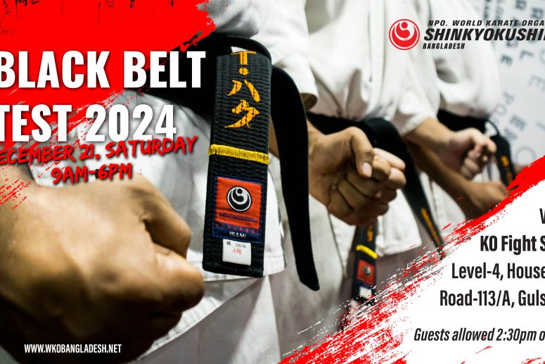 The Black Belt Test 2024 will take place on Saturday, December 21st, from 9:00 AM to 6:00 PM at KO Fight Studio, Gulshan, Dhaka. This marks the fourth Black Belt Test in the history of WKO Bangladesh, proudly organized by KO Fight Studio.