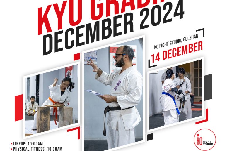 The December ’24 Kyu Grading (White Belt to Green Belt Test) will take place on Saturday, 14th December 2024, starting at 10AM at WKO Shinkyokushin Bangladesh Honbu, KO Fight Studio Gulshan.